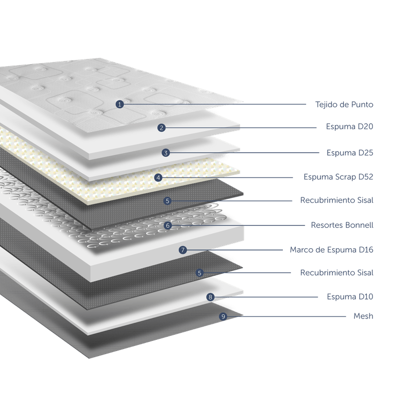 • Buen soporte con resortes Bonnell + Poliuretano de alta densidad + Pillow Top + Super Side