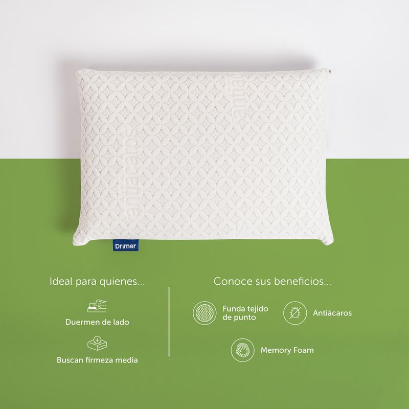 • Relleno: 100% Viscoelástico (Memory Foam) que se adapta a la forma de tu cabeza, eliminando así los puntos de presión tanto de la cabeza como del cuello.